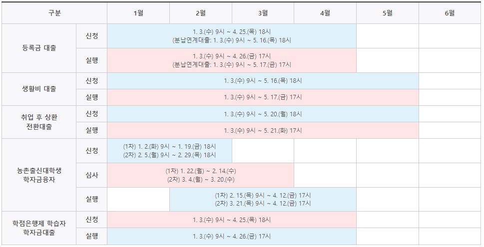 - 등록금대출: 1월 3일(수) 9시 ~ 4월 26일(금) 17시